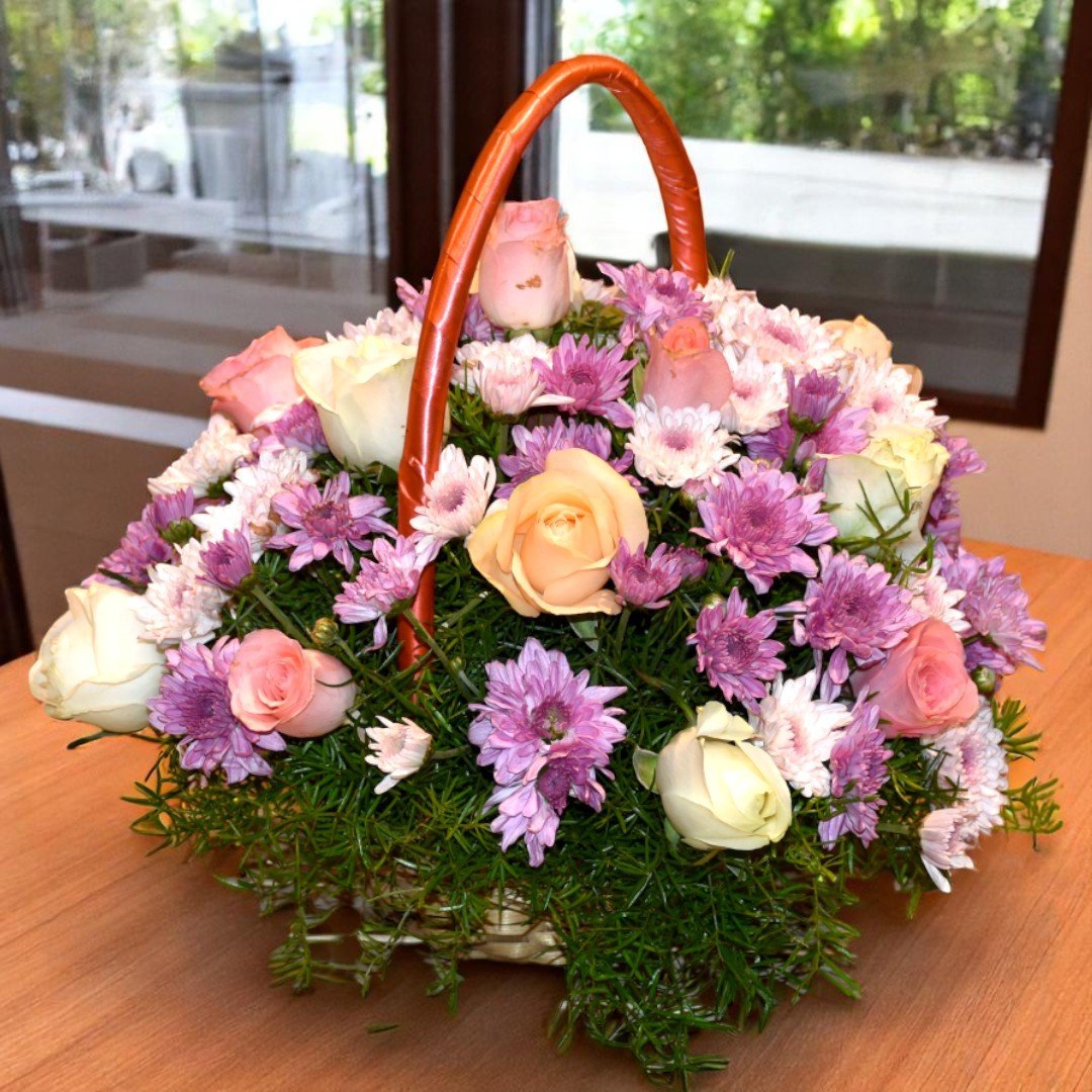 Elevate your space with a captivating Rose and Chrysanthemum basket, a delightful ode to the beauty and contrast of these two exquisite flowers. The soft, delicate petals of the blooming Rose paired with the lush vibrancy of the Chrysanthemum promise to create a visually stunning and sophisticated arrangement.